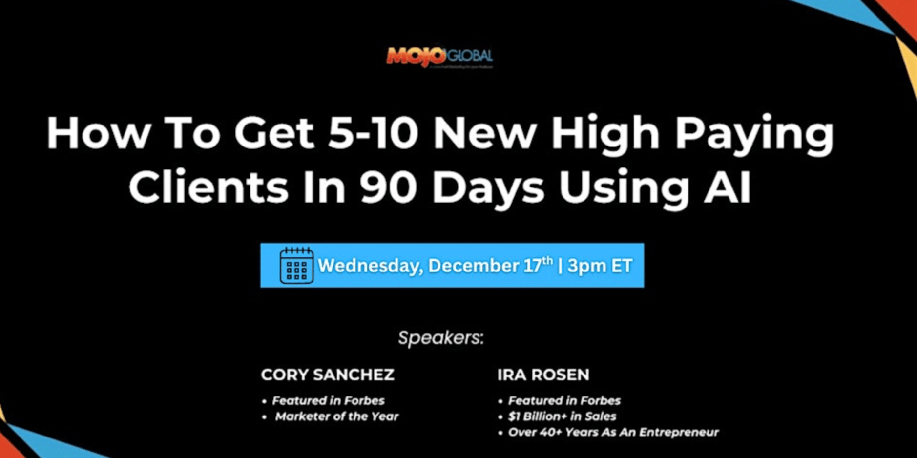 ![]() Building a Multi 6-Figure Biz Through Social Media December 10th | 3pm ET | ![]() How To Get 5-10 New High Paying Clients In 90 Days Using AI December 17th | 3pm ET |